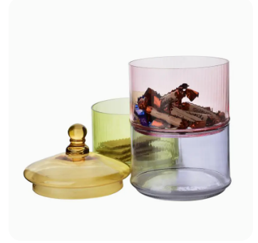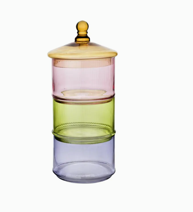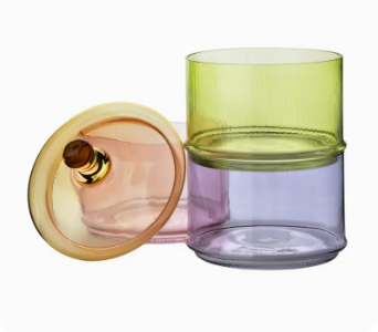 Prozirno obojeno staklo u pastelnoj kombinaciji daje vizualni “handmade” i artisan dojam, savršen za moderne slastičarnice i gastro koncepte koji žele istaknuti ponudu i privući pažnju kupaca. Zlatni poklopac dodaje notu elegancije i premium prezentacije.