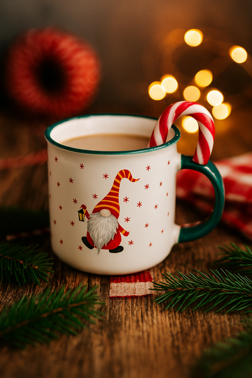 Na njoj je preslatki gnom – jedan drži lampion, a drugi nosi kapicu s prugicama, i obojica izgledaju kao da ti žele poželjeti „dobro jutro“ uz prvi gutljaj kave.