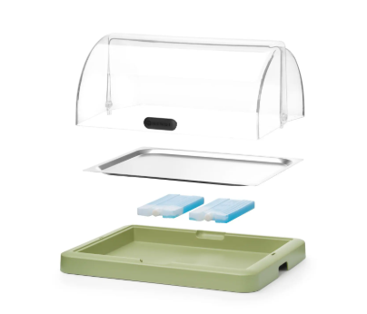 Transparentni roll-top poklopac omogućuje jednostavan pristup hrani bez podizanja cijelog poklopca, čime se održava higijena i svježina proizvoda tijekom posluživanja.