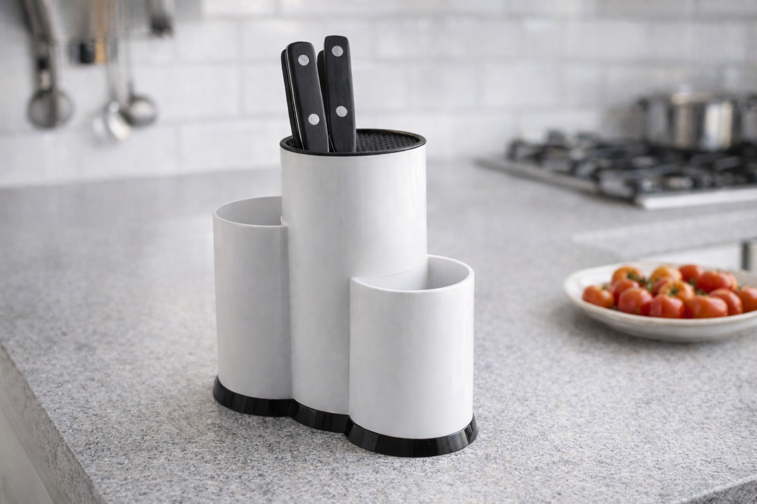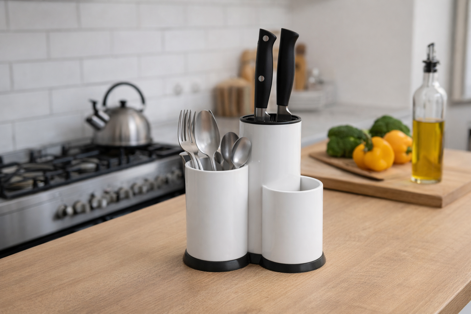 Dizajn s više cilindričnih odjeljaka različitih visina omogućuje odvajanje noževa, vilica, žlica i ostalog kuhinjskog pribora, dok integrirani držač za noževe osigurava sigurno i stabilno spremanje.