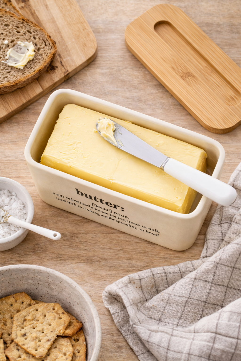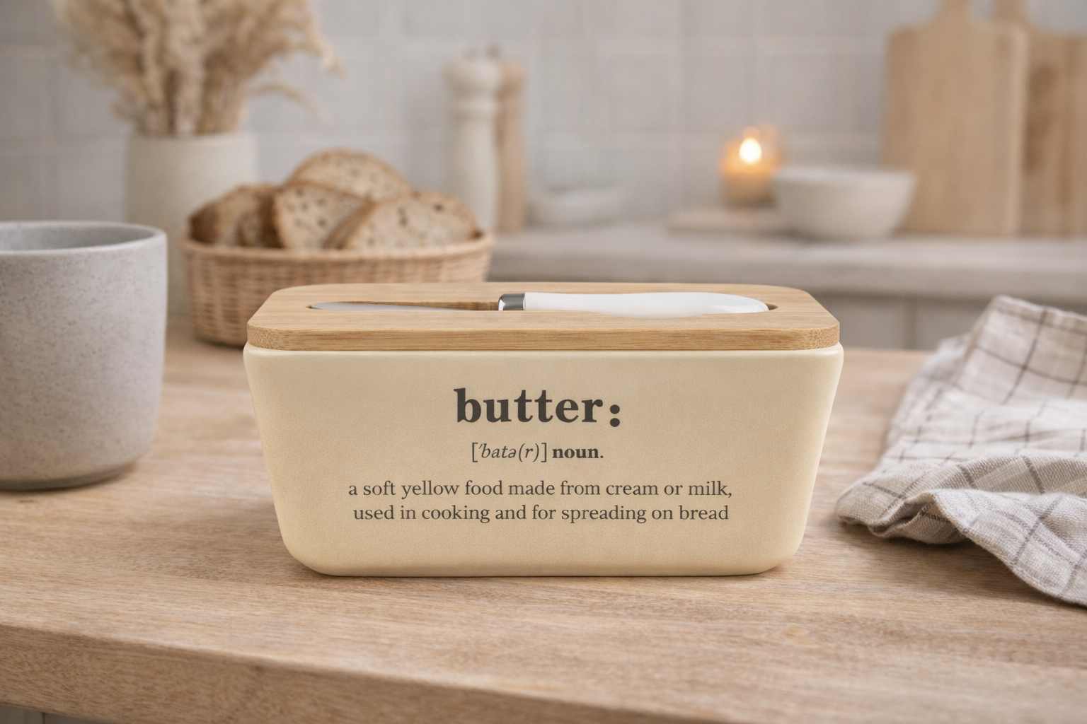 Na prednjoj strani nalazi se minimalistički natpis “butter” s definicijom, koji daje poseban dekorativni karakter i čini ovu posudu idealnom i kao poklon za dom.