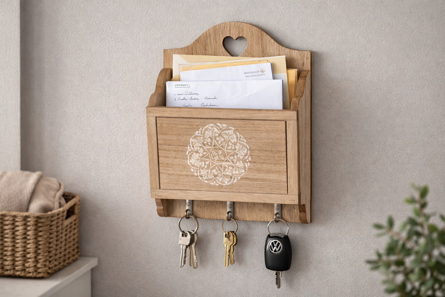 Gornji otvoreni pretinac namijenjen je za poštu, račune, ključeve za goste ili sitne dokumente, dok se u donjem dijelu nalaze 3 metalne kuke za ključeve. Zidna montaža omogućuje urednost u hodniku, kuhinji ili apartmanu bez zauzimanja dodatnog prostora.