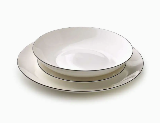 Ovaj klasični bijeli servis s decentnim crnim obrubom donosi modernu jednostavnost i profinjenost, idealan za restorane, hotele, apartmane ili kao poklon za posebne prigode.
