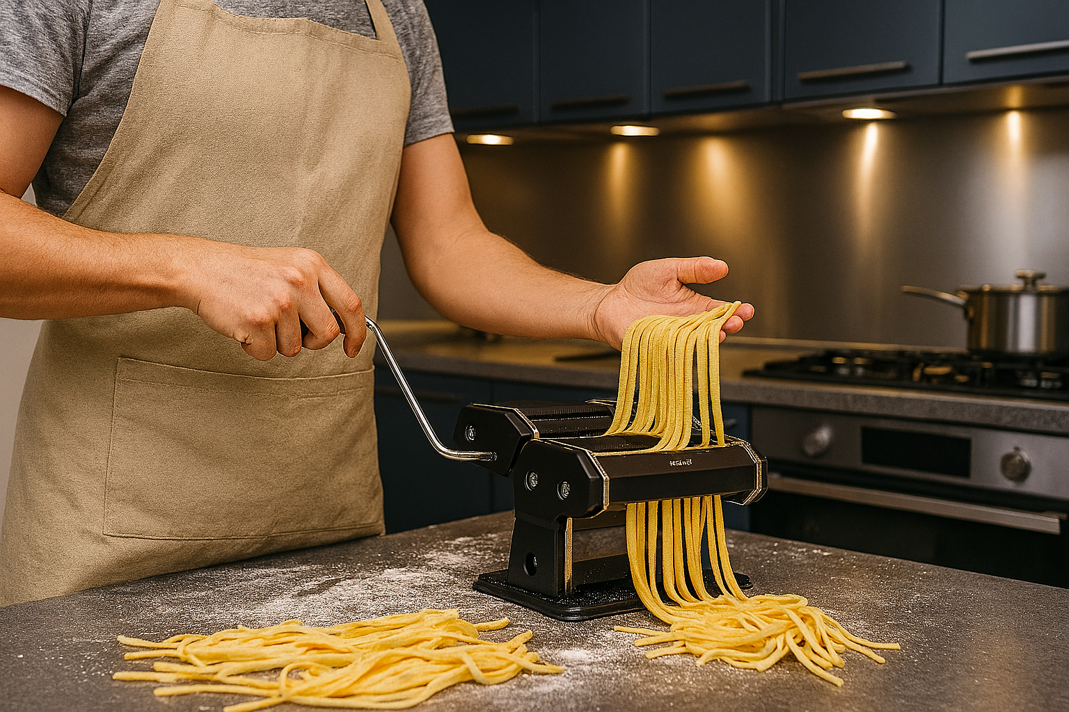 Čvrsta konstrukcija i precizni čelični valjci omogućuju ravnomjerno valjanje tijesta, dok izmjenjivi noževi osiguravaju savršeno rezanje tagliatella (6 mm) i linguina (2 mm). Ručni pogon daje vam potpunu kontrolu nad procesom bez potrebe za električnom energijom, a stabilna stega drži aparat čvrsto na mjestu.
