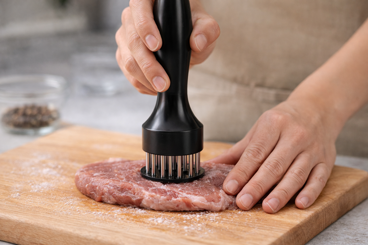 Praktičan ručni omekšivač mesa s 16 čeličnih igala omogućuje brzo i učinkovito omekšavanje mesa prije pečenja ili mariniranja.