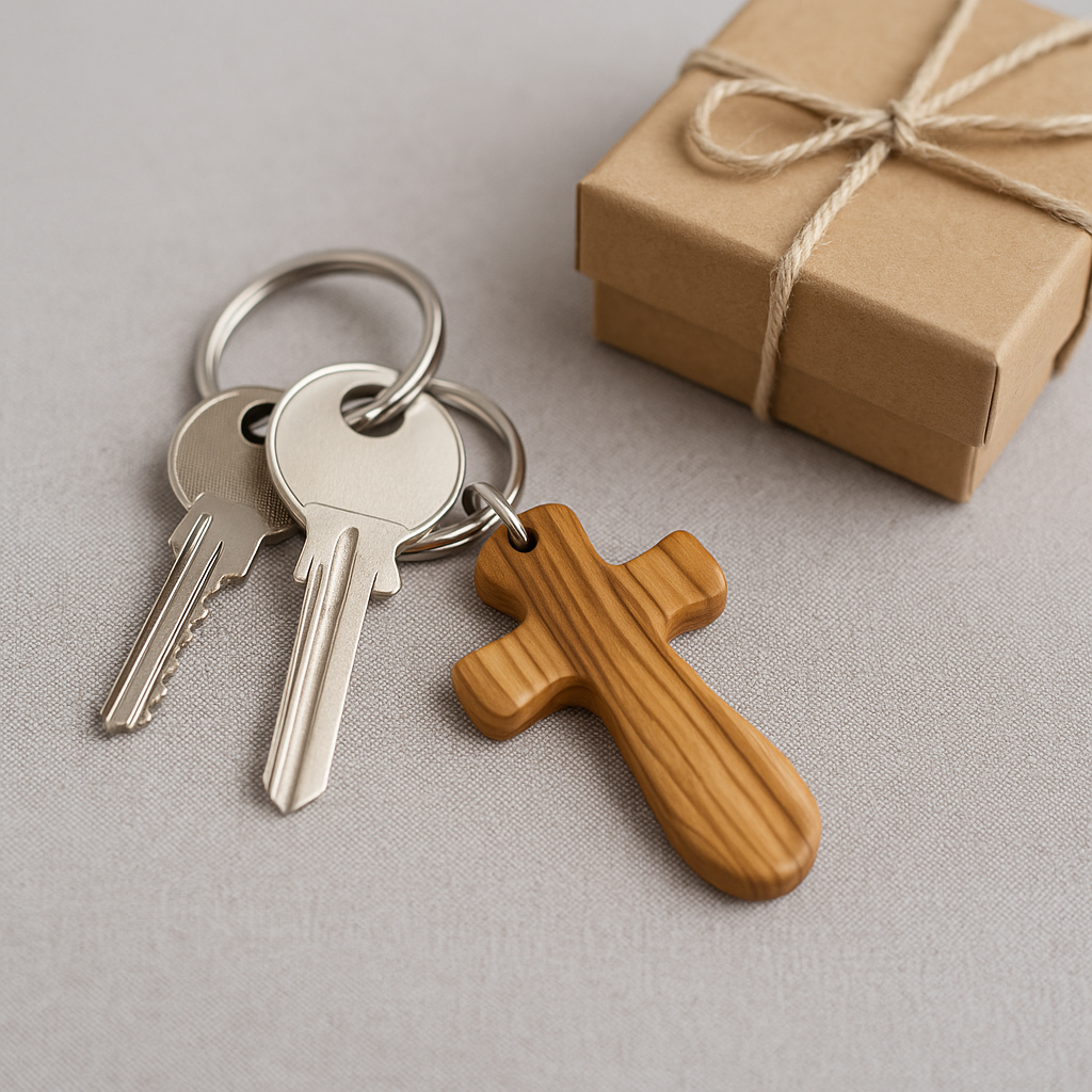 Ručno izrađen iz jednog komada masline, ovaj privjesak odiše prirodnom toplinom i unikatnim uzorkom drveta. Praktičan je kao privjesak za ključeve, ali i kao duhovni podsjetnik u svakodnevnom životu.
