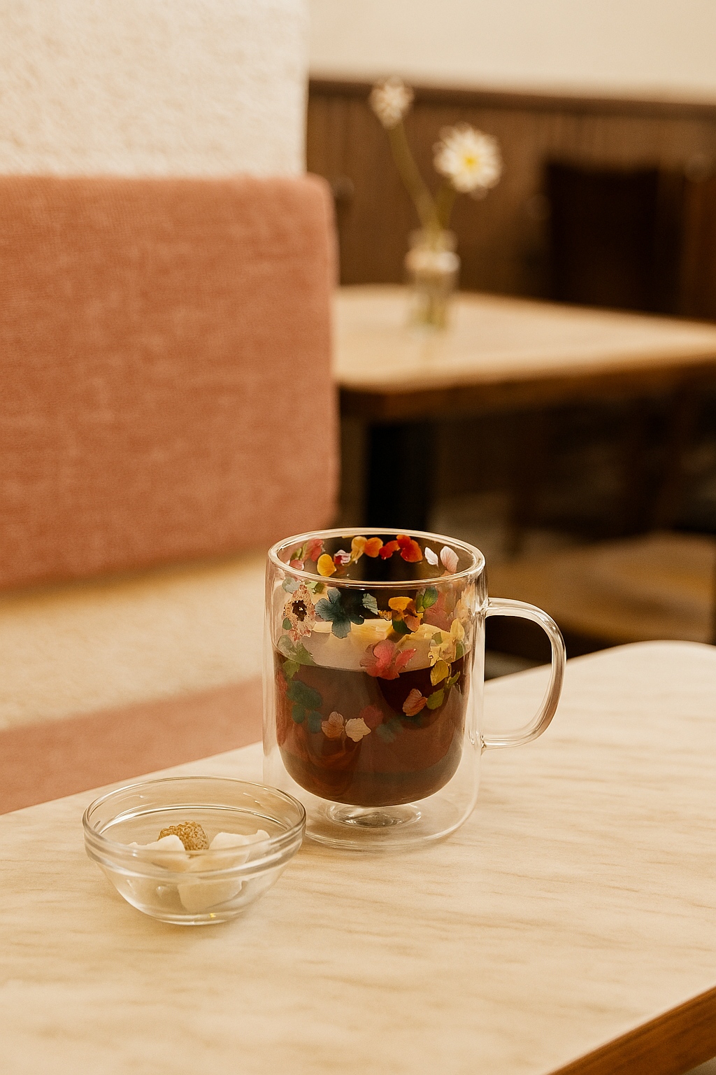 Ono što je čini potpuno jedinstvenom su pravi sušeni cvjetovi pažljivo postavljeni između slojeva stakla, stvarajući nježan, prirodan uzorak koji svako ispijanje čaja, kave ili biljnog napitka pretvara u estetski doživljaj.