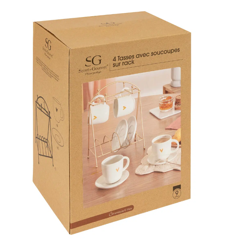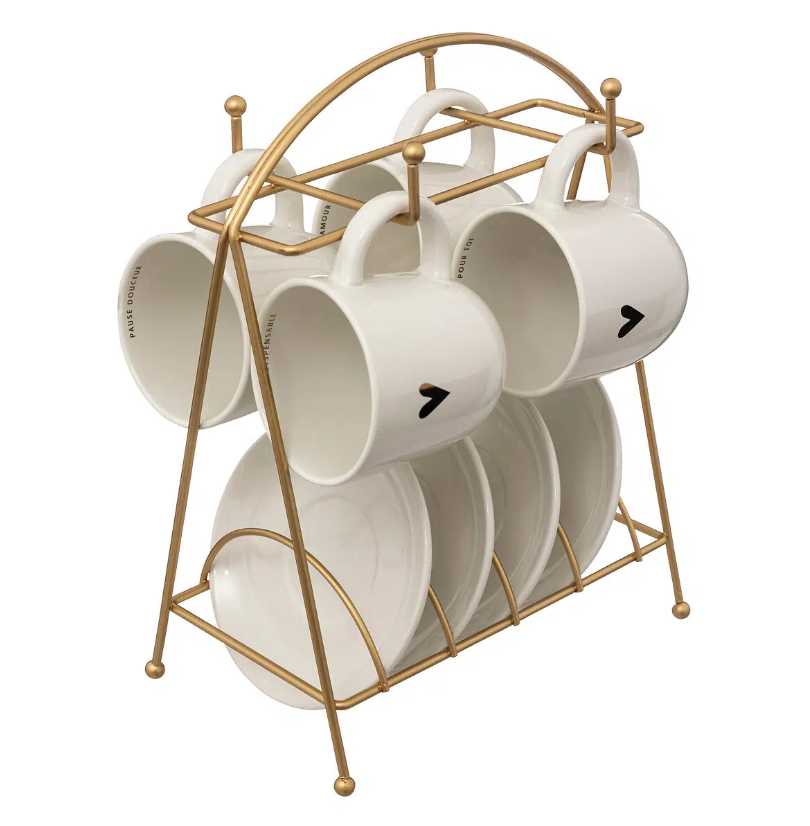 Unesite šarm i funkcionalnost u svoj prostor uz ovaj elegantni set od 9 keramičkih šalica s tanjurićima, uredno posloženih na metalnom stalku.