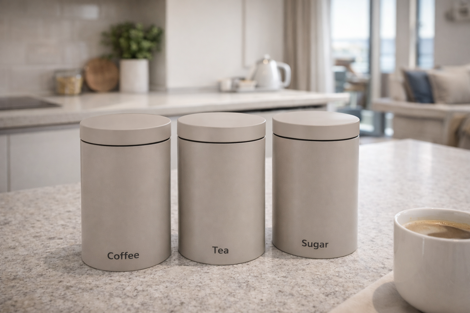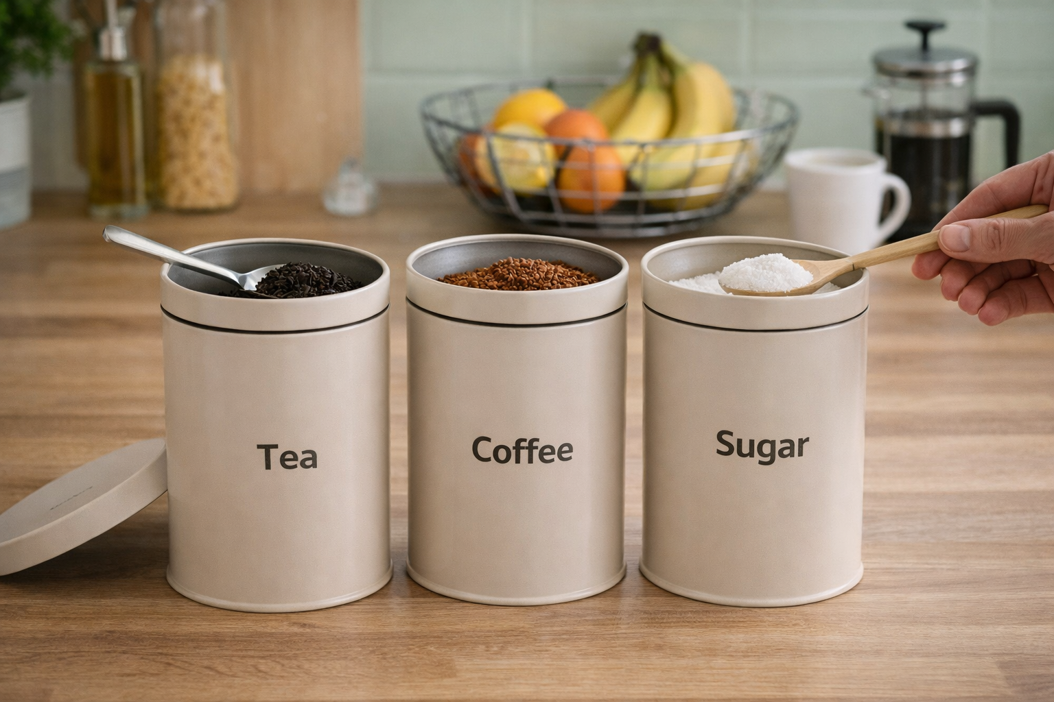 Neutralna bež boja i minimalistički natpisi Tea / Coffee / Sugar lako se uklapaju u moderne, skandinavske i mediteranske interijere.