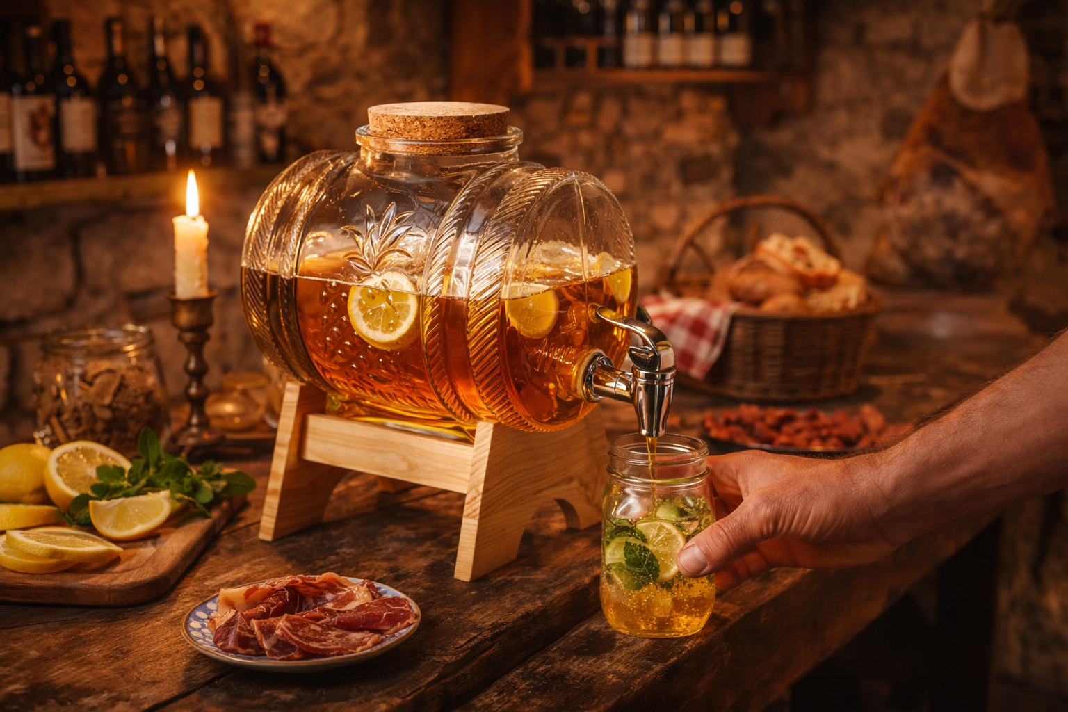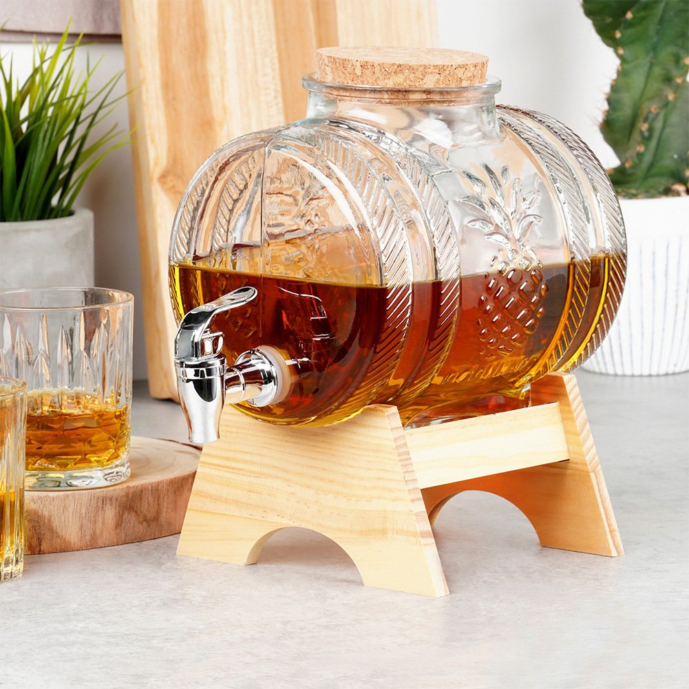 Praktičan i dekorativan stakleni dispenzer s pipom zapremine 3 litre idealan je za posluživanje domaćih sokova, limunade, ledenog čaja, vina ili pića s voćem i ledom. Zahvaljujući obliku bačvice i drvenom postolju, savršeno se uklapa u konobe, kuće za odmor, terase, domjenke i blagdanske stolove.