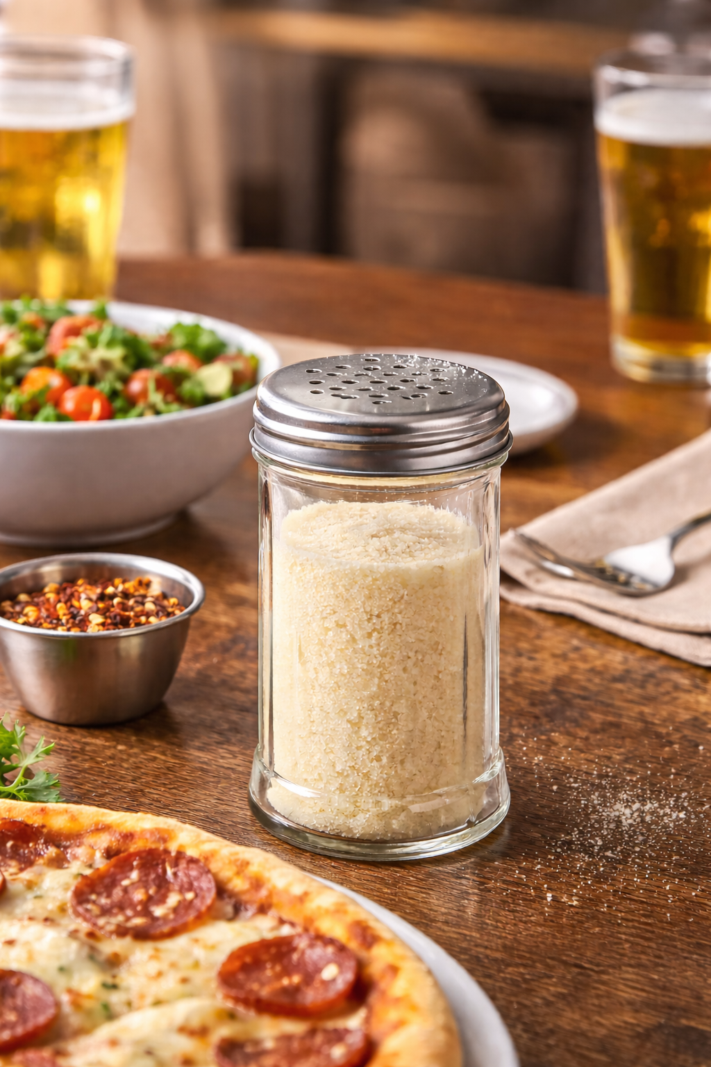 Prozirno staklo omogućuje brzu kontrolu sadržaja, dok metalni perforirani poklopac osigurava ravnomjerno posipanje začina bez rasipanja.