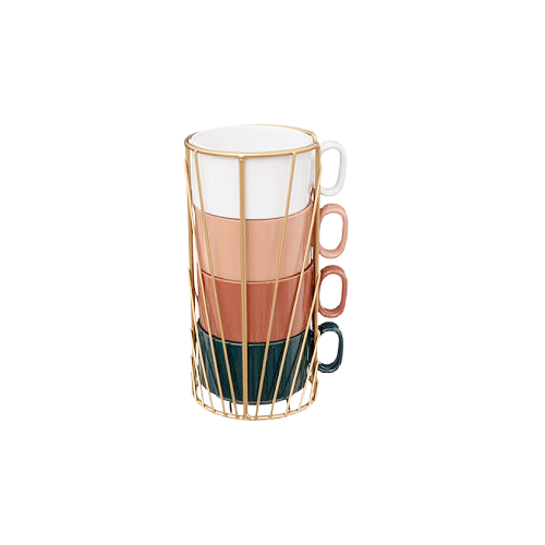 Šalice dolaze u elegantnom metalnom stalku koji štedi prostor i omogućuje uredno slaganje na kuhinjskoj polici ili šanku.