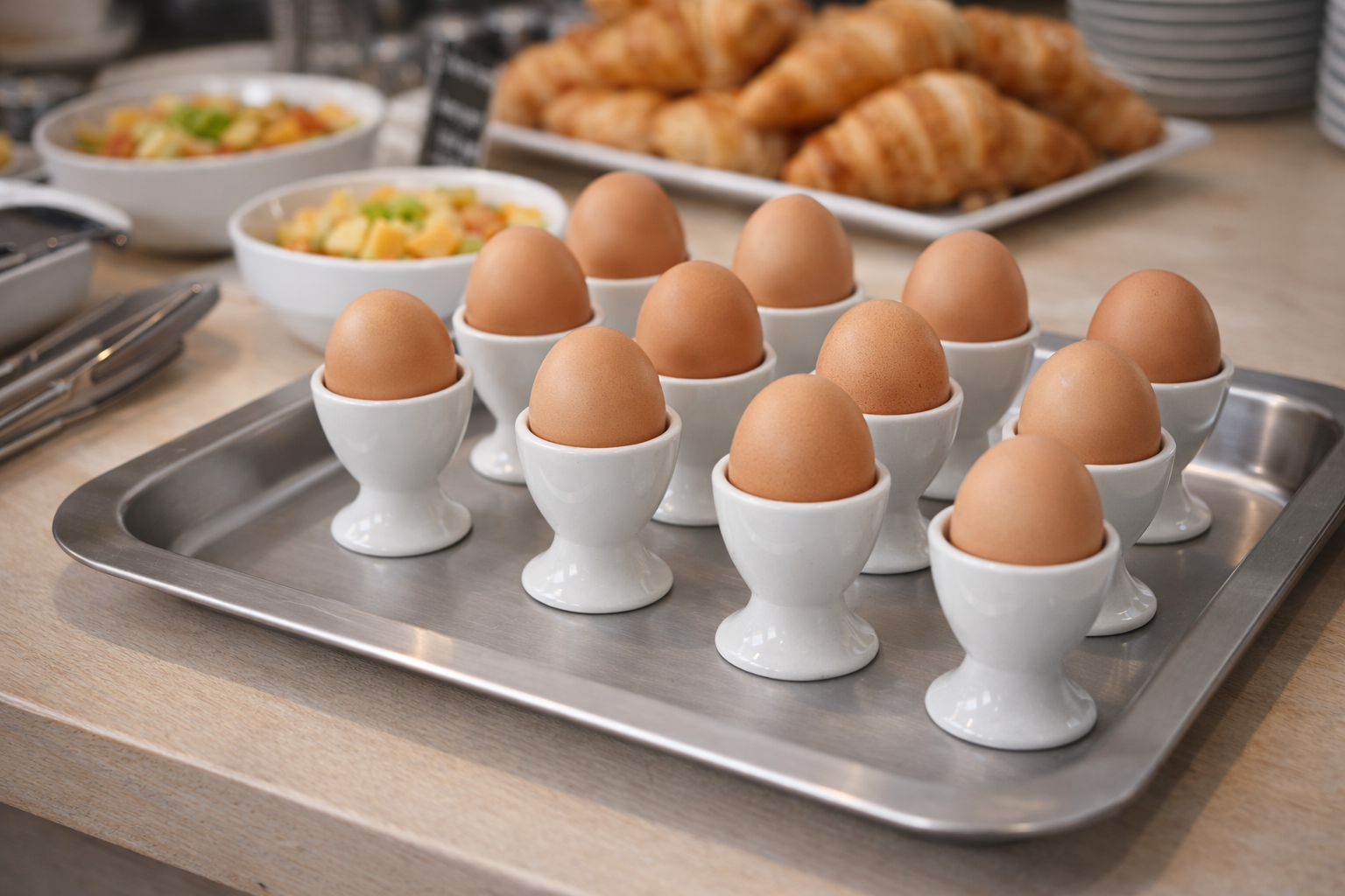 Stalak za jaje 5,5 cm – Medri praktičan je i neizostavan dodatak za hotelske doručke, buffet stolove i profesionalnu HoReCa upotrebu. Klasičan oblik i neutralna bijela boja omogućuju urednu i higijensku prezentaciju kuhanih jaja na švedskom stolu, uz jednostavno slaganje i posluživanje.