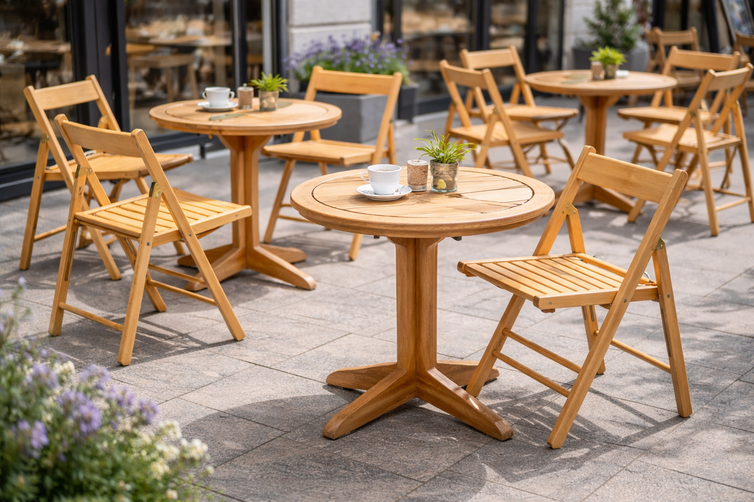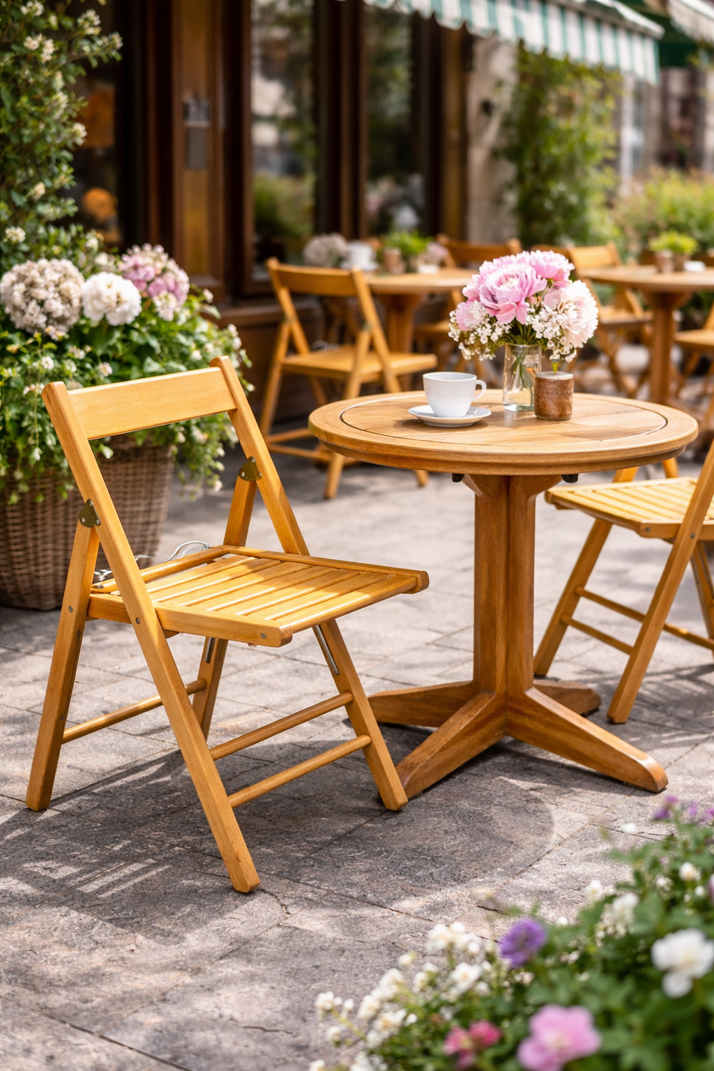 Sklopivi mehanizam omogućuje brzo spremanje i jednostavno rukovanje, što je čini posebno pogodnom za restorane, bistroe i evente s čestim promjenama rasporeda. Glatko obrađena drvena površina pruža ugodan osjećaj pri sjedenju i lako se održava, dok prirodna boja drveta donosi toplinu i autentičan mediteranski ugođaj u svaki prostor.