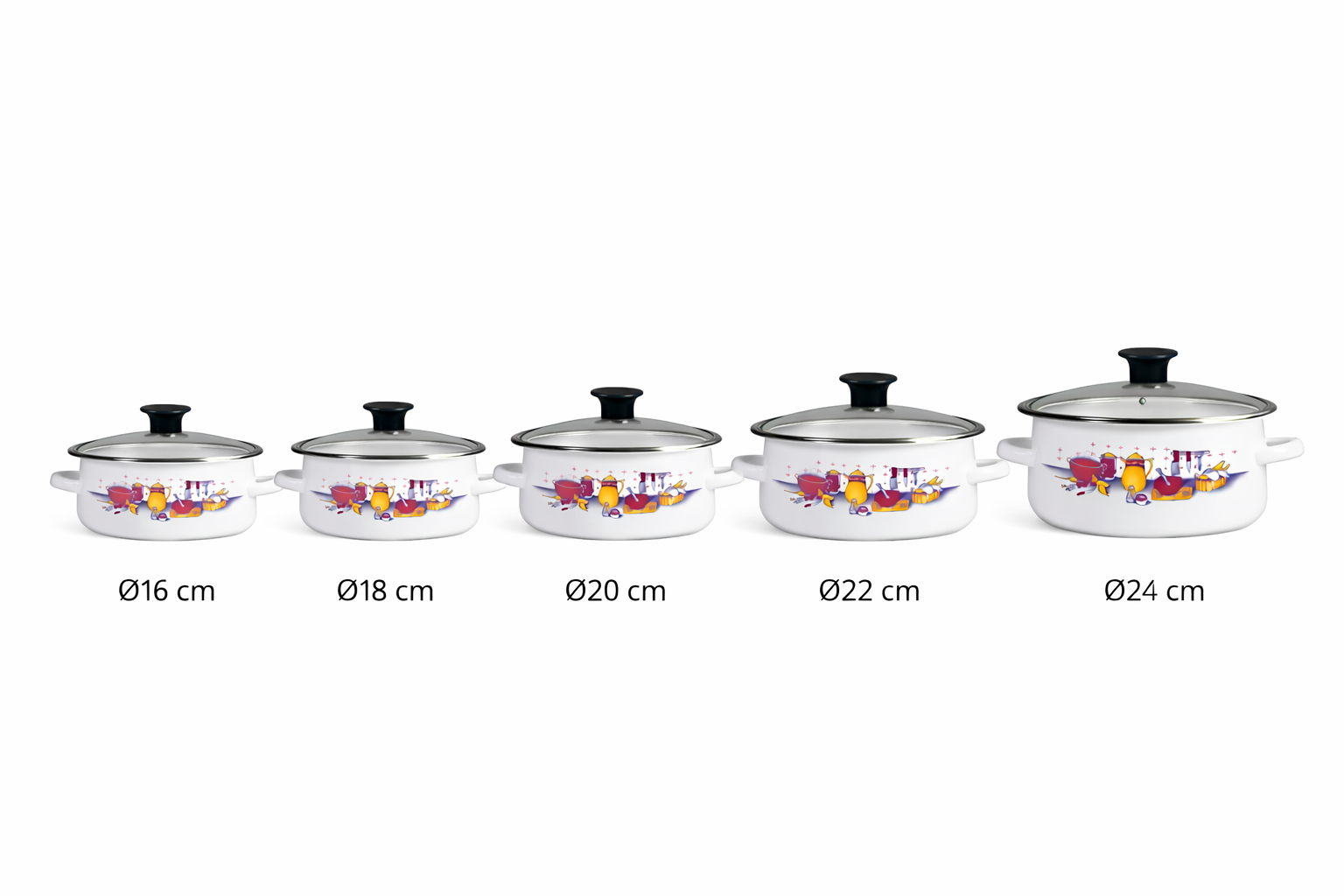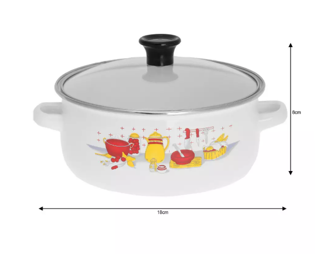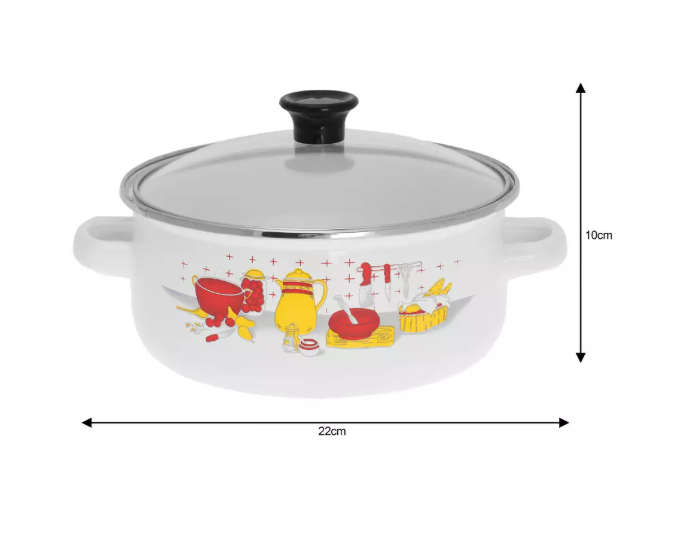 Izrađena je od čelika s emajliranom završnom obradom, što osigurava ravnomjerno zagrijavanje, dugotrajnost i jednostavno održavanje. Rub je dodatno ojačan inox obrubom, a stakleni poklopac omogućuje kontrolu kuhanja bez podizanja.