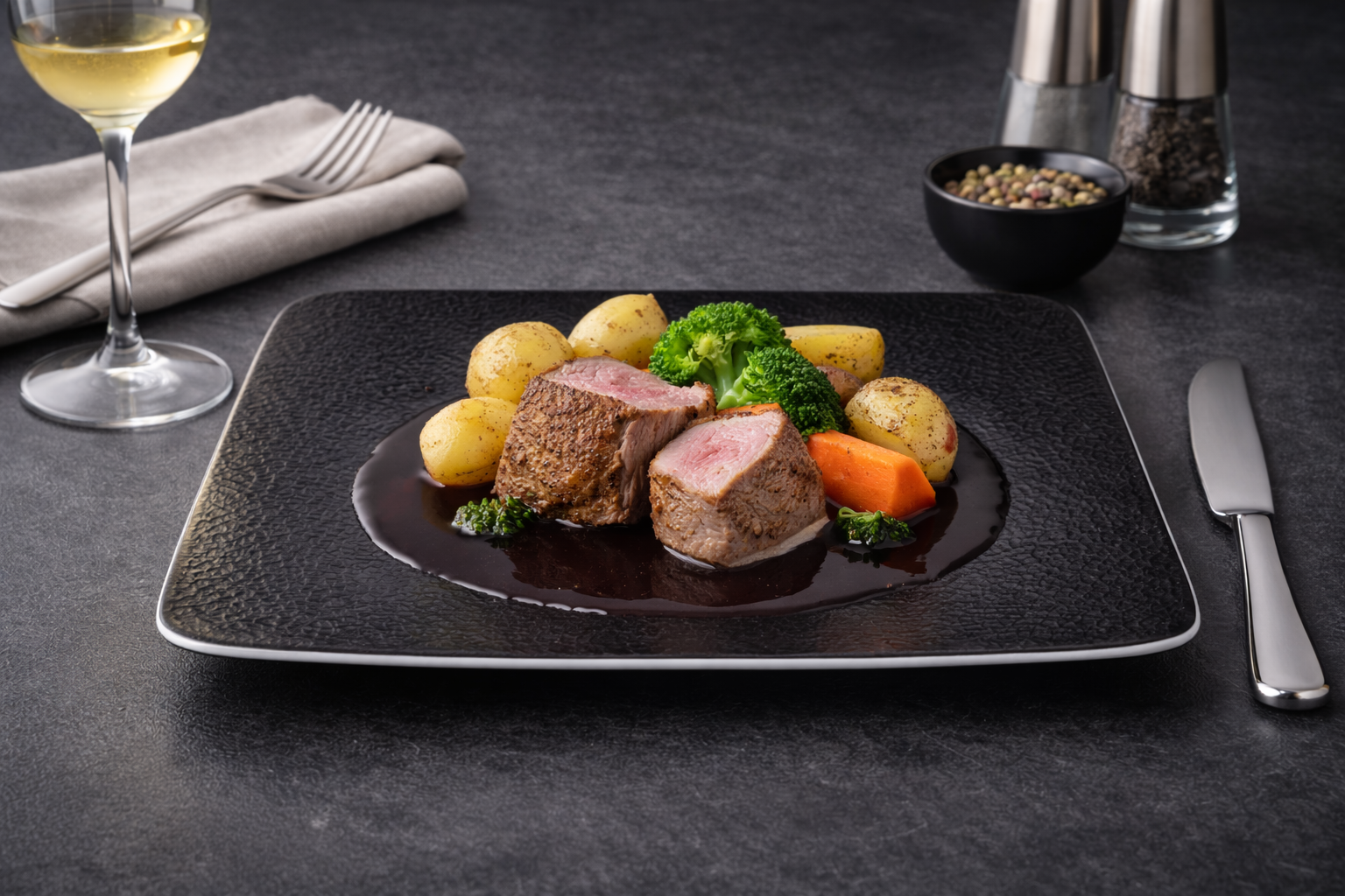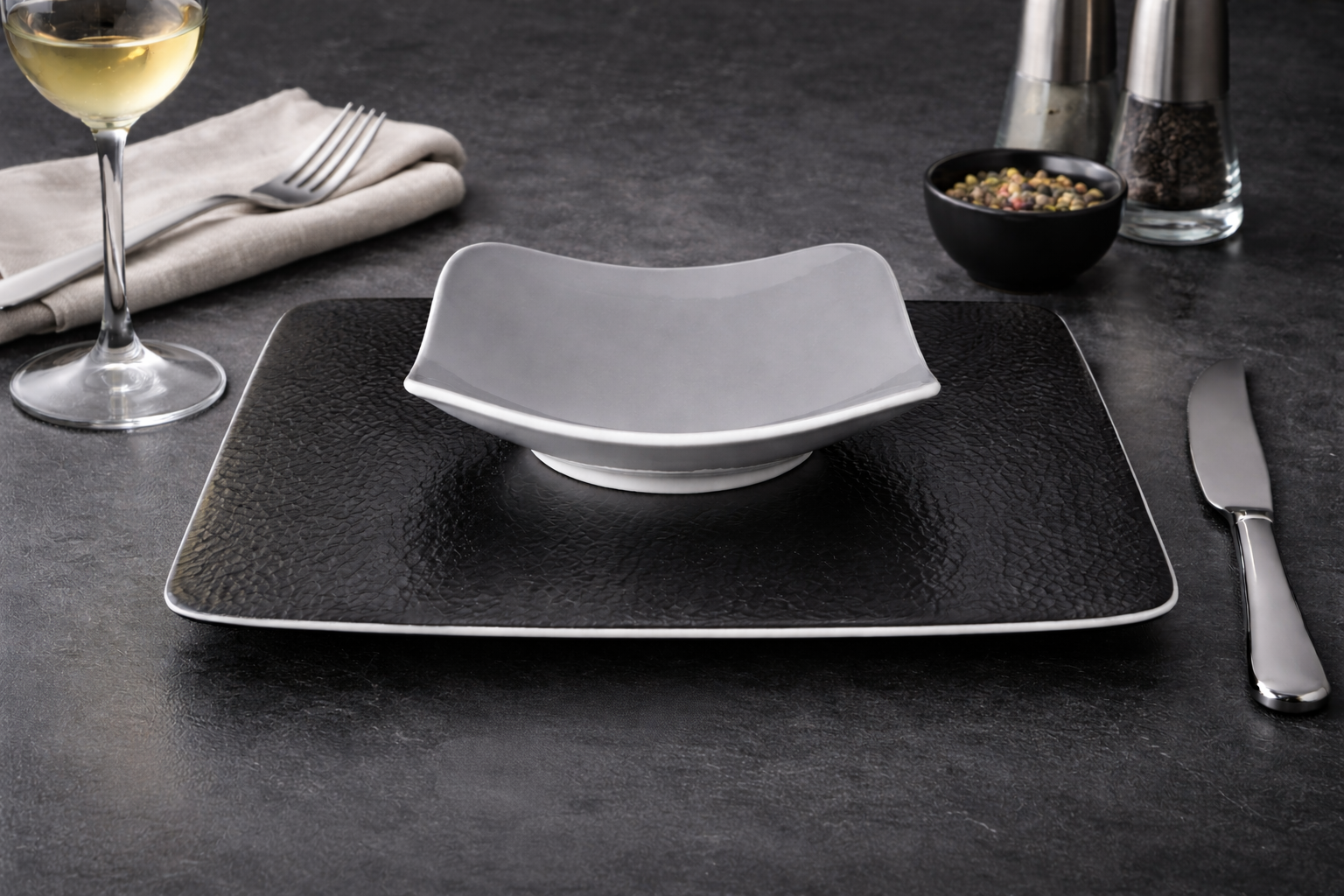 Kvadratni tanjur Coupe 29×29 cm profesionalni je izbor za restorane, hotele i moderne koncepte posluživanja koji traže vizualni wow-efekt i funkcionalnost u svakodnevnom radu. Blago zaobljeni coupe oblik daje tanjuru volumen i dubinu, dok tamna reljefna tekstura naglašava prezentaciju jela i čini svaki tanjur idealnom podlogom za fine dining, à la carte i sharing koncepte.