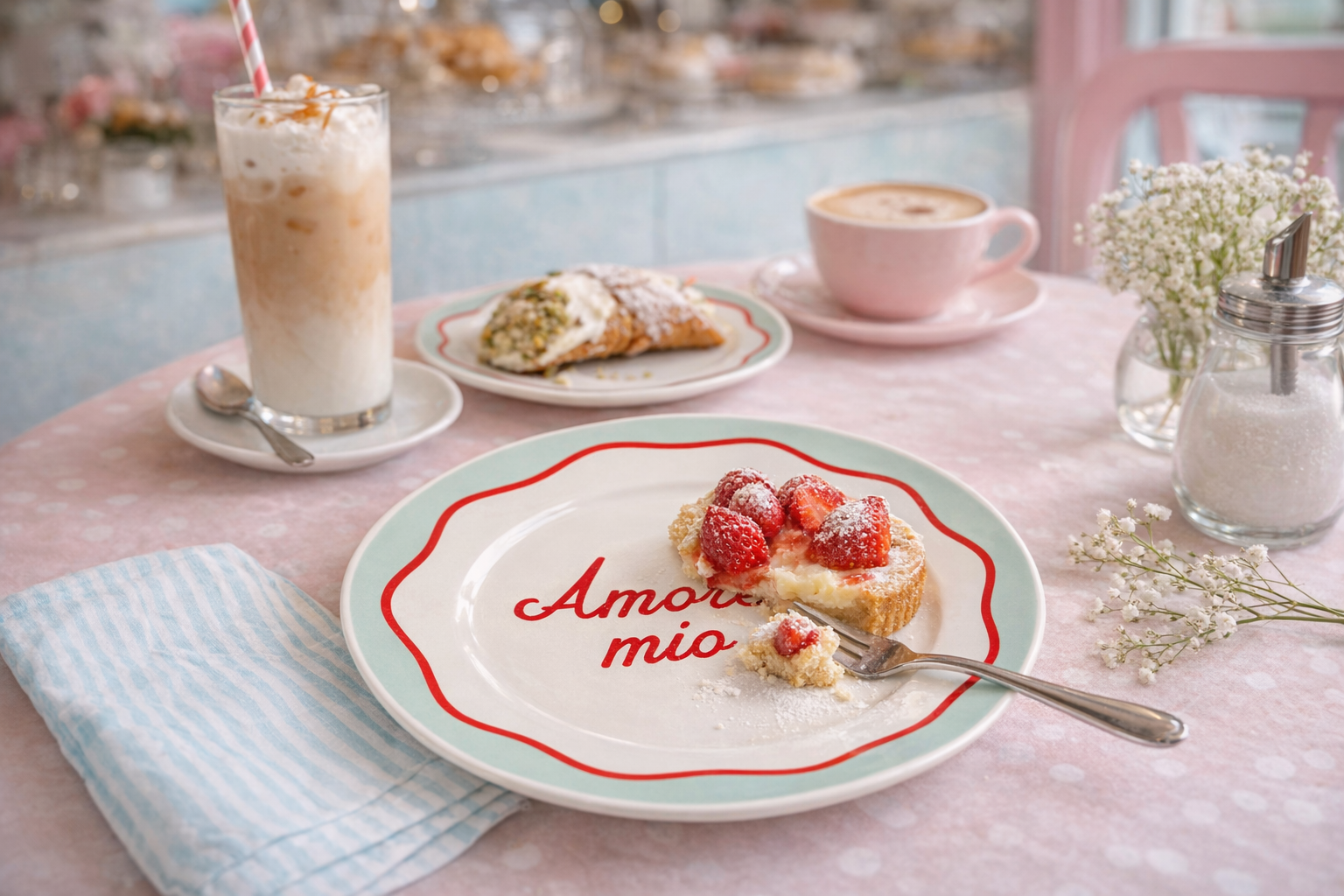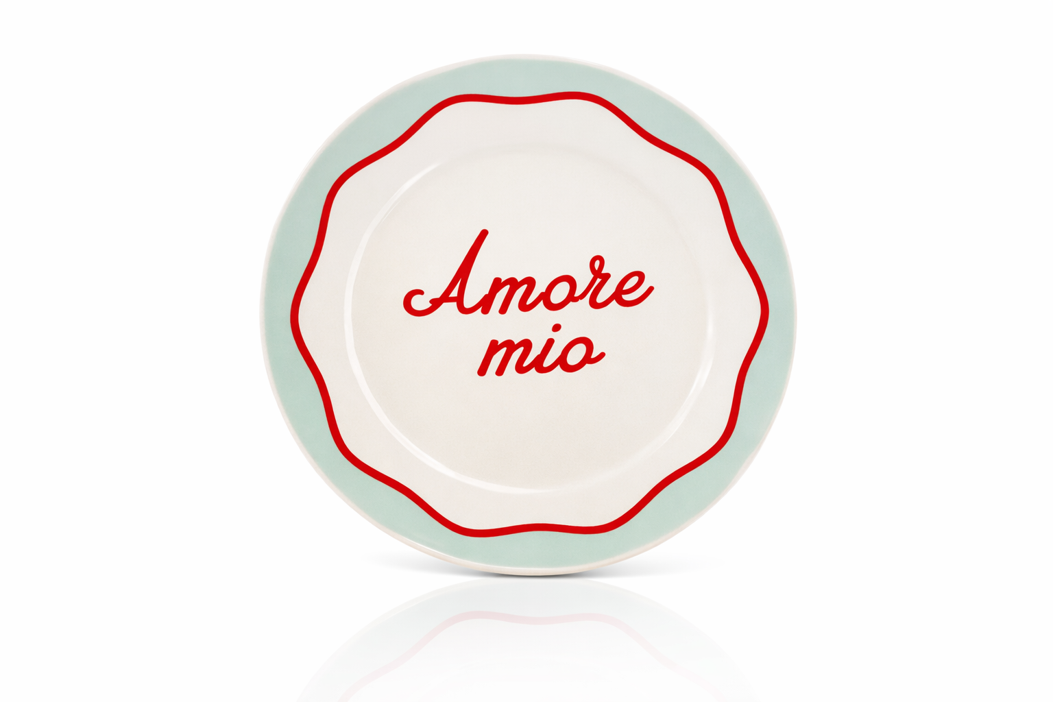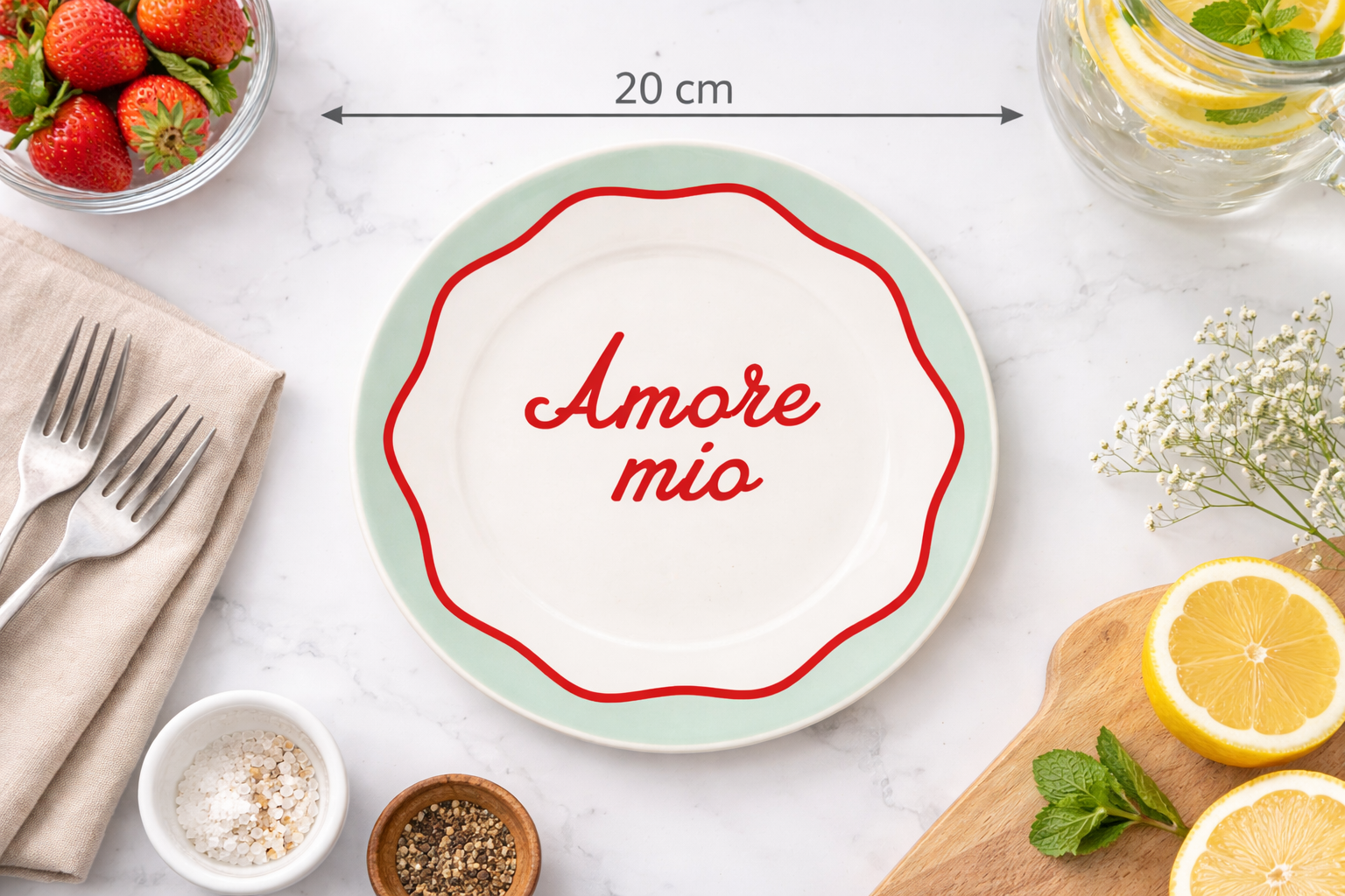 Ovaj porculanski tanjur promjera 20 cm idealan je za deserte, kolače, paste, doručke i male obroke, a dizajnom poručuje emociju – Amore mio.