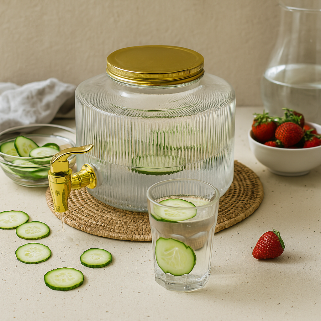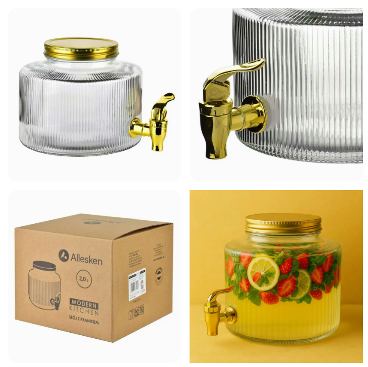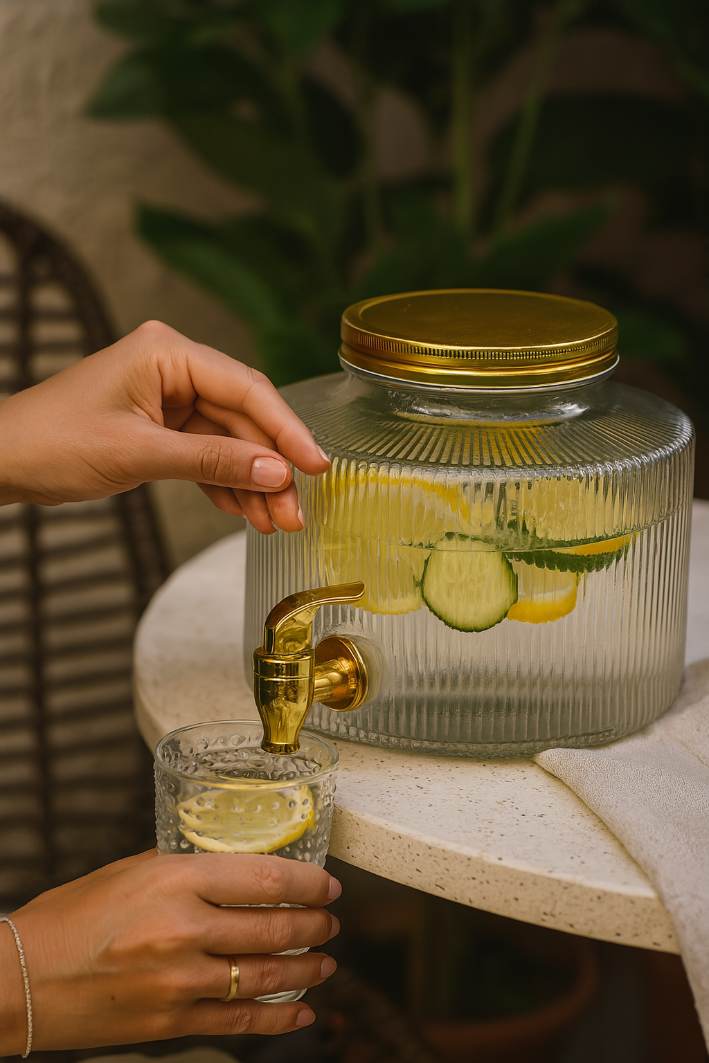Zahvaljujući ugrađenom pipcu, gosti mogu sami točiti piće bez potrebe za podizanjem tegle. Minimalistički dizajn s zlatnim poklopcem uklapa se u svaki stil – od rustikalnog do modernog.