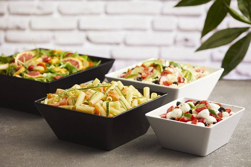 Leone melaminska četvrtasta zdjela 30×30×11,5 cm – crna idealan je izbor za moderno buffet posluživanje, restorane, hotele i catering događanja. Zahvaljujući elegantnom mat crnom dizajnu i pravilnom četvrtastom obliku, ova zdjela savršeno ističe salate, paste, priloge, finger food i razne hladne ili tople zalogaje.